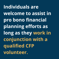 Dauphiné: Individuals (such as paraplanners, students and other colleagues) are welcome to assist in pro bono financial planning efforts as long as they work in conjunction with a qualified CFP volunteer. As FFP cannot vet each volunteer individually, we rely on and require the CFP credential to signify that each volunteer has achieved specific educational, experiential and ethical requirements – and that they will act as a fiduciary with each client.