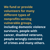 Dauphiné: Pro bono has helped struggling people achieve amazing things, like moving past a terrible debt spiral to actually being able to afford their first home. Our 2022 Impact Report has the best recent overview of our work. Each year, we fund or provide volunteers for many different types of nonprofits serving vulnerable groups, including domestic violence survivors, people with cancer, disabled veterans, people wrongly convicted of crimes and many others.