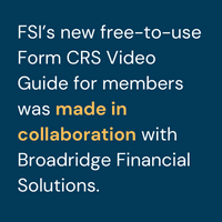 FSI’s new free-to-use Form CRS Video Guide for FSI members, made in collaboration with Broadridge Financial Solutions, consists of three straightforward 90-second videos designed to help independent wealth management firms and their advisors explain to clients the ins and outs of the Regulation Best Interest relationship summary.