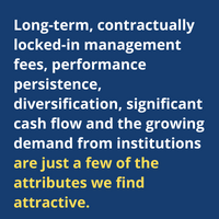 Long-term, contractually locked-in management fees, performance persistence, diversification, significant cash flow and the growing demand from institutions are just a few of the attributes we and others find attractive.