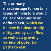 The primary disadvantage for certain types of investors would be lack of liquidity or defined exit, which we believe is substantially mitigated by cash flow, as well as a growing variety of potential paths to exit.