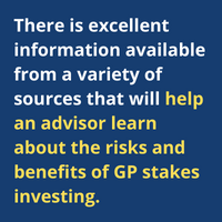 Second, get educated. There is excellent information available from a variety of sources that will help an advisor learn about the risks and benefits of GP stakes investing. We are happy to help with that education as well as provide third party research and data to help advisors determine whether GP stakes are appropriate for their clients.