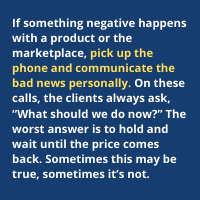 - Fourth – Be the first to communicate bad news. If something negative happens with a product or the marketplace, pick up the phone and communicate the bad news personally. On these calls, the clients always ask, “What should we do now?” The worst answer is to hold and wait until the price comes back. Sometimes this may be true, sometimes it’s not. If the price drops further, the customer will now hold you doubly responsible for the loss. Have a well thought-out action plan for the client on each and every call. Sometimes taking a loss now is better than taking a bigger loss later.