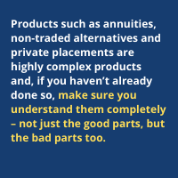 - Third – Honesty is of course great, but it’s not enough on its own. You need to thoroughly understand the products you are selling. Products such as annuities, non-traded alternatives and private placements are highly complex products and, if you haven’t already done so, make sure you understand them completely – not just the good parts, but the bad parts too. I know the temptation is to only discuss the parts of the product that will help the client, but it’s imperative to discuss potential downside risks as clearly as possible. This includes covering issues like surrender charges, illiquidity, pricing, and risk in the conversation.