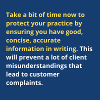 - Lastly – keep your books and records up to date. Make sure the information on your client is accurate. Take good, clear notes on each conversation. Document what everyone says for future reference. Follow up with your clients by sending them a letter after each meeting. Outline the discussion and the action plan so there won’t be any misunderstandings later. Take a bit of time now to protect your practice by ensuring you have good, concise, accurate information in writing. This will prevent a lot of client misunderstandings that lead to customer complaints.