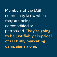 In Castillo’s opinion, “Members of the LGBT community know when they are being commodified or patronized. They’re going to be justifiably skeptical of slick ally marketing campaigns alone.”