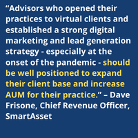 "With a significant number of investors gathering information online before making an investment decision, advisors must be equipped to meet prospective clients online in order to grow their businesses. Advisors who opened their practices to virtual clients and established a strong digital marketing and lead generation strategy - especially at the onset of the pandemic - should be well positioned to expand their client base and increase AUM for their practice," said Dave Frisone, SmartAsset's Chief Revenue Officer.
