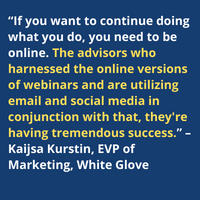 "The advisors who harnessed the online versions of webinars and are utilizing email and social media in conjunction with that, they're having tremendous success. Those are the folks that are now back to doing in-person mixed with online," she said.