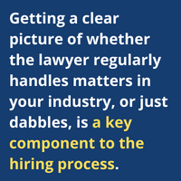 Getting a clear picture of whether the lawyer regularly handles matters in your industry, or just dabbles, is a key component to the hiring process.