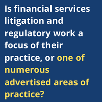 Review their biographies on their firm websites: Is financial services litigation and regulatory work a focus of their practice, or one of numerous advertised areas of practice? Then interview each of them, listening equally to what they say and how they say it.