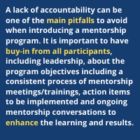 A lack of accountability can be one of the main pitfalls to avoid when introducing a mentorship program. It is important to have buy-in from all participants, including leadership, about the program objectives including a consistent process of mentorship meetings/trainings, action items to be implemented and ongoing mentorship conversations to enhance the learning and results.
