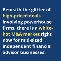 Beneath the glitter of high-priced deals involving powerhouse firms, there is a white-hot M&A market right now for mid-sized independent financial advisor businesses – Defined by WSR as practices that have been established for at least a decade, with total client assets of roughly $200 million to $400 million, encompassing one to four professionals or staff members.
