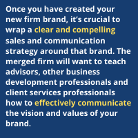 And third, once you have created your new firm brand, it’s crucial to wrap a clear and compelling sales and communication strategy around that brand. The merged firm will want to teach advisors, other business development professionals and client services professionals how to effectively communicate the vision and values of your brand. Ideally, all team members will be singing the same tune as to why your firm is the best solution for your ideal clients.
