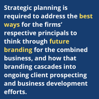 Strategic planning is required to address the best ways for the firms’ respective principals to think through future branding for the combined business, and how that branding cascades into ongoing client prospecting and business development efforts.