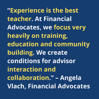 Angela Vlach, Financial Advocates: Experience is the best teacher. At Financial Advocates, we focus very heavily on training, education and community building. We create conditions for advisor interaction and collaboration. We also host study groups, which help to facilitate the learning process.