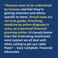 Humans want to be understood by humans and feel they’re getting attention and advice specific to them. Virtual tools are not true guides. Practicing medicine by online diagnosis is scary, as is personal financial planning online. It’s barely better than the frustrating automated voice system we all deal with when calling to get our cable fixed.
