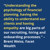 Brent Weiss, Facet Wealth: We applaud the CFP® Board for adding a section about the psychology of financial planning, because that’s critically important to helping clients succeed. Understanding the psychology of financial planning, having the ability to understand our clients and having empathy are big parts of our recruiting, hiring and onboarding processes.