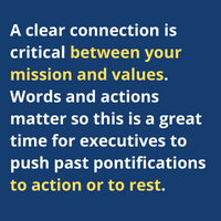 Finally, a clear connection is critical between your mission and values. Words and actions matter so this is a great time for executives to push past pontifications to action or to rest.