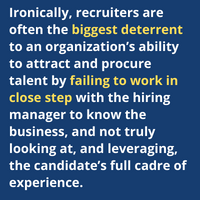 Ironically, recruiters are often the biggest deterrent to an organization’s ability to attract and procure talent by failing to work in close step with the hiring manager to know the business, and not truly looking at, and leveraging, the candidate’s full cadre of experience.