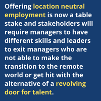 Offering location neutral employment is now a table stake and stakeholders will require managers to have different skills and leaders to exit managers who are not able to make the transition to the remote world or get hit with the alternative of a revolving door for talent.