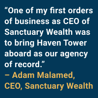 “Haven Tower Group is the single most effective wealth management communications agency that I’ve worked with across multiple firms,” said Adam Malamed, CEO of Sancutary Wealth. “The tone is set at the top by Joe Kuo, their CEO, who has an amazing work ethic and goes out of his way to ensure his firm’s clients enjoy constant access to senior level professionals delivering an exceptional service experience and clear results that support broader growth goals.”