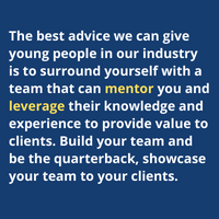 The best advice we can give young people in our industry is to surround yourself with a team that can mentor you and leverage their knowledge and experience to provide value to clients. Build your team and be the quarterback, showcase your team to your clients.