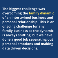 The biggest challenge was overcoming the family dynamic of an intertwined business and personal relationship. This is an ongoing challenge for any family business as the dynamic is always shifting, but we have done a good job separating out personal emotions and making data driven decisions.