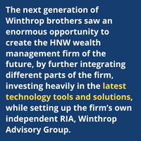 The next generation of Winthrop brothers saw an enormous opportunity to create the HNW wealth management firm of the future, by further integrating different parts of the firm, investing heavily in the latest technology tools and solutions, while setting up the firm’s own independent RIA, Winthrop Advisory Group.