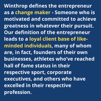 Winthrop defines the entrepreneur as a change maker - Someone who is motivated and committed to achieve greatness in whatever their pursuit.