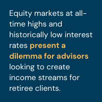 Jamie Mackay, Vice President of Business Development at Atlanta-based Strategic Financial Alliance (SFA), an independent broker-dealer and RIA, said, “Equity markets at all-time highs and historically low interest rates present a dilemma for advisors looking to create income streams for retiree clients.”
