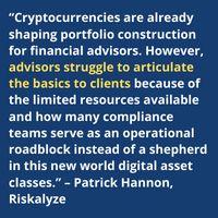 Cryptocurrencies are already shaping portfolio construction for financial advisors. However, advisors struggle to articulate the basics to clients because of the limited resources available and how many compliance teams serve as an operational roadblock instead of a shepherd in this new world digital asset classes.