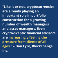 Like it or not, cryptocurrencies are already playing an important role in portfolio construction for a growing number of wealth managers and asset managers. Even crypto-skeptic financial advisors are increasingly feeling the pressure from clients of all ages.