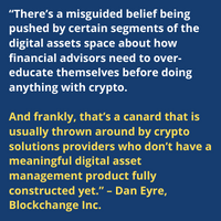 In terms of how financial advisors can best engage with crypto as an asset class, there’s a misguided belief being pushed by certain segments of the digital assets space about how financial advisors need to over-educate themselves before doing anything with crypto.