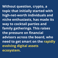 Without question, crypto, a topic that initially started with high-net-worth individuals and niche enthusiasts, has made its way to cocktail parties and family gatherings. This raises the pressure on financial advisors across the board, who need to get smart on the rapidly evolving digital assets ecosystem.