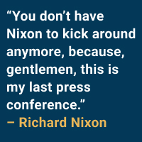 But I will write something anyway: In the infamous words of Richard Nixon, “You don’t have Nixon to kick around anymore, because, gentlemen, this is my last press conference.”