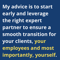 Succession plans require 10 to 20 years to do the job properly. As someone who has assisted hundreds, possibly thousands, of advisors seeking to build a multi-generational firm, I can assure you it’s within your reach. My advice is to start early and leverage the right expert partner to ensure a smooth transition for your clients, your employees and most importantly, yourself.