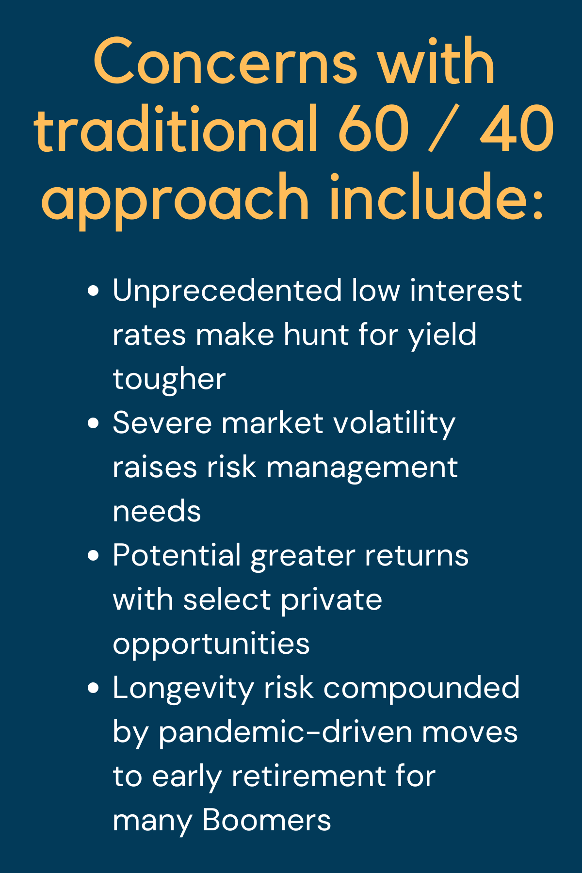 Foremost among these themes? A heightened focus on increased investing in the private markets, versus the historic emphasis on publicly traded equities and fixed income vehicles only.
