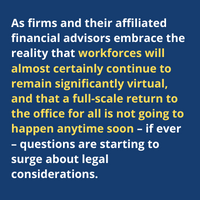 As firms and their affiliated financial advisors embrace the reality that workforces will almost certainly continue to remain significantly virtual, and that a full-scale return to the office for all is not going to happen anytime soon – if ever – questions are starting to surge about legal considerations.