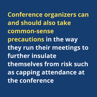 But, for conference organizers intent on holding their event in-person the key is having attendees sign agreements providing the meeting sponsors air-tight waivers of liability, and an express acknowledgement that attendees assume any and all risks from choosing to attend.