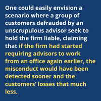 For example, one could easily envision a scenario where a group of customers defrauded by an unscrupulous advisor seek to hold the firm liable, claiming that if the firm had started requiring advisors to work from an office again earlier, the misconduct would have been detected sooner and the customers’ losses that much less.