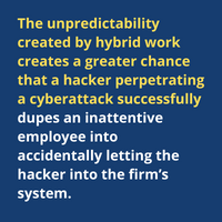 The unpredictability created by hybrid work creates a greater chance that a hacker perpetrating a cyberattack successfully dupes an inattentive employee into accidentally letting the hacker into the firm’s system.