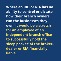 Where an IBD or RIA has no ability to control or dictate how their branch owners run the businesses they own, it would be a stretch for an employee of an independent branch office to successfully hold the “deep pocket” of the broker-dealer or RIA financially liable.
