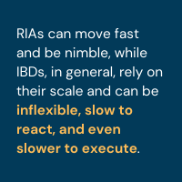 RIAs can move fast and be nimble, while IBDs, in general, rely on their scale and can be inflexible, slow to react, and even slower to execute.