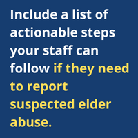 These policies should define elder abuse, while also providing guidance on red flags. You’ll also need to include a list of actionable steps your staff can follow if they need to report suspected elder abuse. Such policies may include placing a hold on any transaction impacted by the past, current or attempted financial exploitation for a specified period.