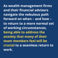 As wealth management firms and their financial advisors navigate the nebulous path forward on when – and how – to return to a more normal set of working circumstances, being able to address the anxiety that many of their team members feel will be crucial to a seamless return to work.