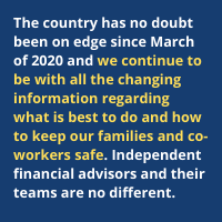 The country has no doubt been on edge since March of 2020 and we continue to be with all the changing information regarding what is best to do and how to keep our families and co-workers safe. Independent financial advisors and their teams are no different.