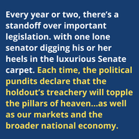 Every year or two, there’s a standoff over important legislation. with one lone senator digging his or her heels in the luxurious Senate carpet. Each time, the political pundits declare that the holdout’s treachery will topple the pillars of heaven…as well as our markets and the broader national economy.