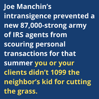 Joe Manchin’s intransigence prevented a new 87,000-strong army of IRS agents from scouring personal transactions for that summer you or your clients didn’t 1099 the neighbor’s kid for cutting the grass.