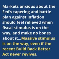 Markets anxious about the Fed’s tapering and battle plan against inflation should feel relieved when fiscal stimulus is on the way, and make no bones about it…Massive stimulus is on the way, even if the recent Build Back Better Act never revives.