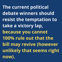 With all that said, the current political debate winners should resist the temptation to take a victory lap, because you cannot 100% rule out that the bill may revive (however unlikely that seems right now).